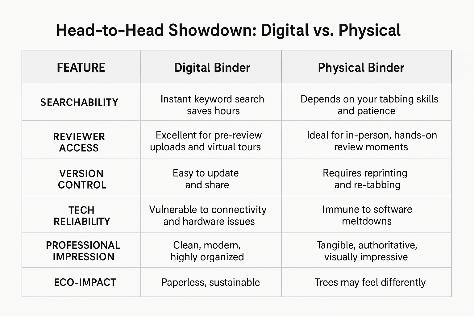 Physical binders also shine when technology falters. Wi‑Fi down? Laptop rebooting? Reviewer unfamiliar with your SharePoint? No problem. Flip to the tabbed section, point confidently, and let the binder do the talking.